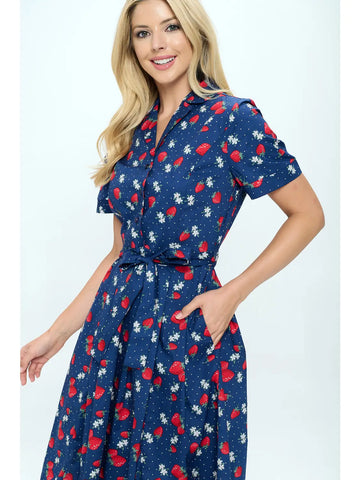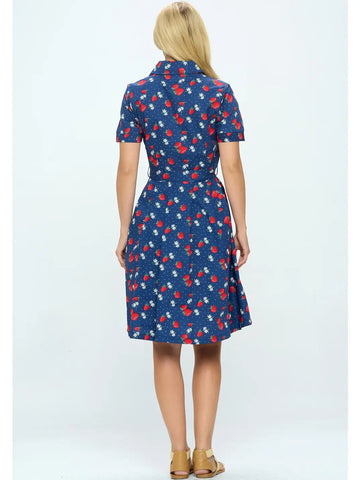 Cotton strawberry print button down dress with short sleeve and pocket