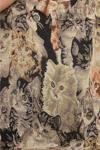 This large tote bag is crafted from a tapestry-style fabric featuring a detailed, woven collage of various fluffy kittens.
